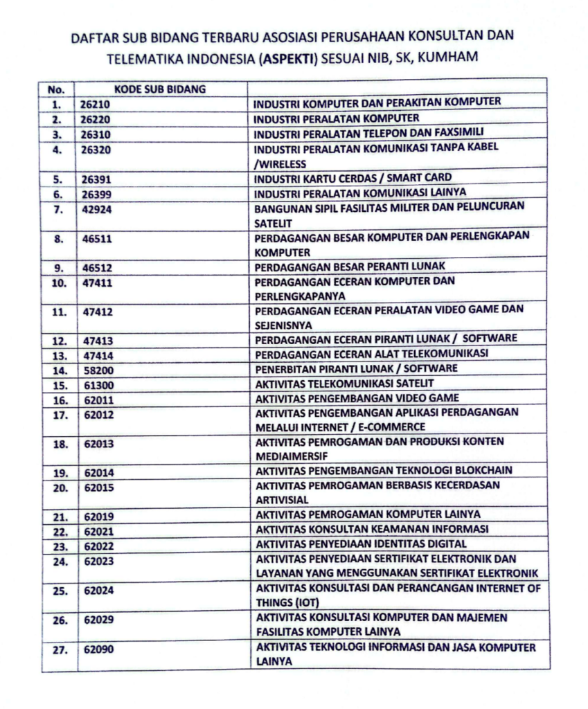 Daftar subbidang Asosiasi Perusahaan dan Konsultan Telematika Indonesia